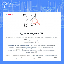 - Такая ошибка может возникать, если сведений об адресе нет в государственном адресном реестре (ГАР) или они различаются в ГАР и Едином государственном реестре недвижимости (ЕГРН).